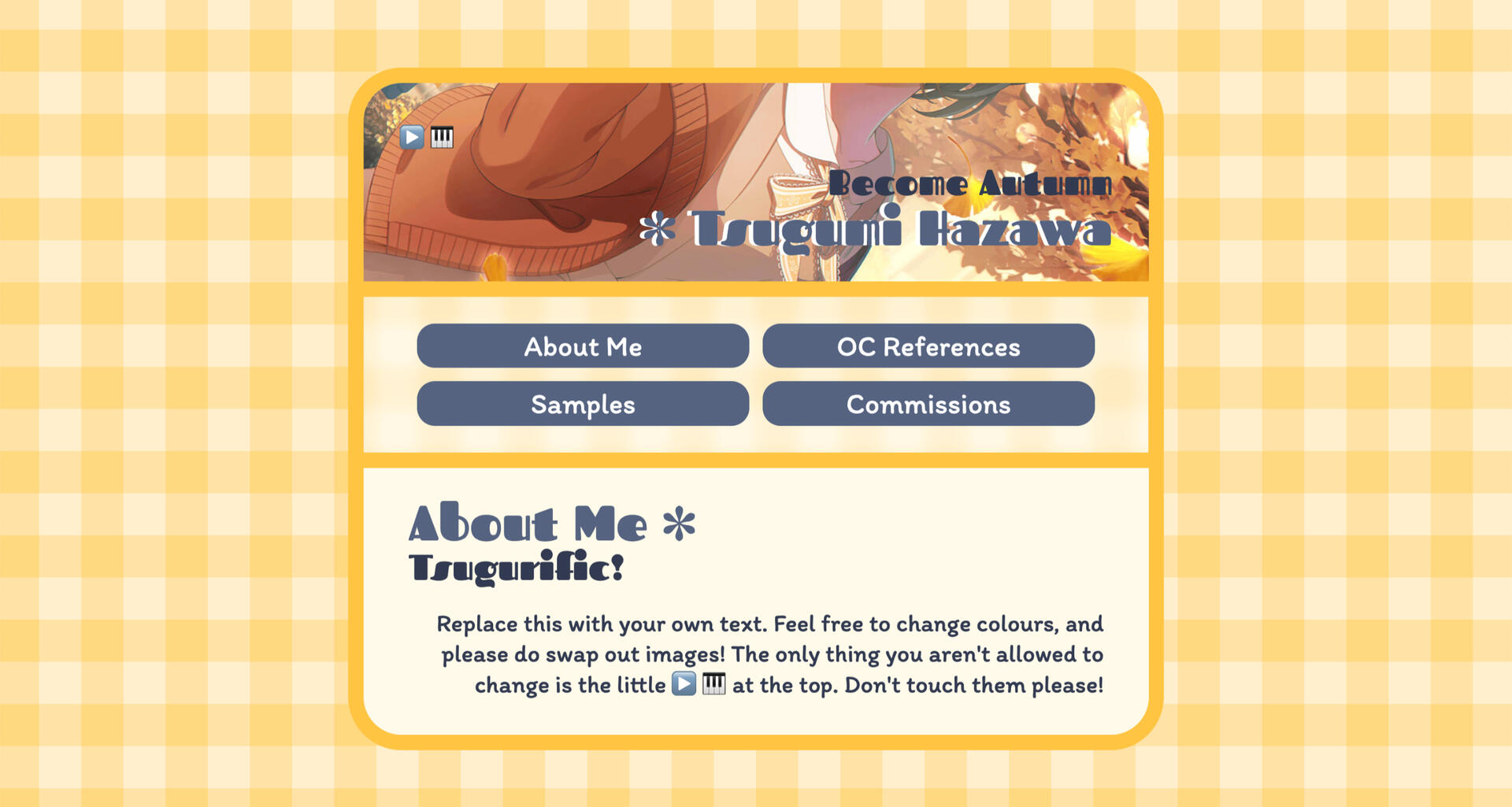 So long as you keep my little keyboard and play square (which link to this site and the page to get the site respectively) then you can change anything you like; I'd like people to be able to find this whole thing if they want one too. If you want to get rid of my little watermark, speak to me about it.I don't believe my work is impressive enough to offer commissions, but if you're wanting to throw a little money my way in return for a custom site, I wouldn't mind that. All sites linked from here were designed by myself, including this one (though this was a very rushed job lol).Oh, and I don't endorse whatever hate crimes you decide to commit with my templates. I'd rather you don't commit them in the first place but I'm not sure I get a choice in the matter.